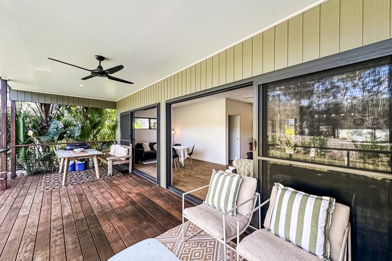 With three spacious bedrooms, each featuring built-in robes and ceiling fans, this home provides plenty of space for families, downsizers, or those seeking a serene island escape. The luxurious central bathroom includes a freestanding bathtub, perfect for soaking the day away, and the convenience of two separate toilets enhances everyday living.