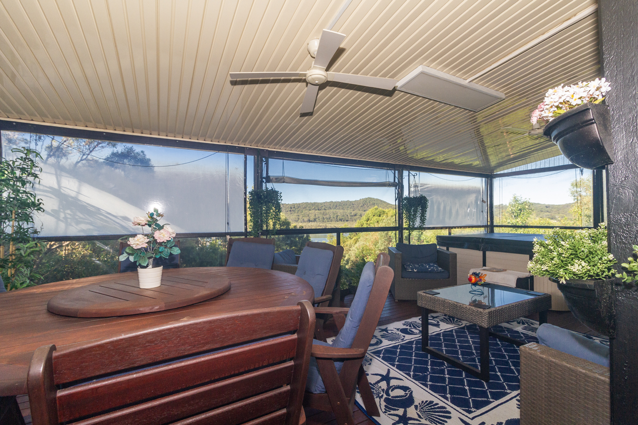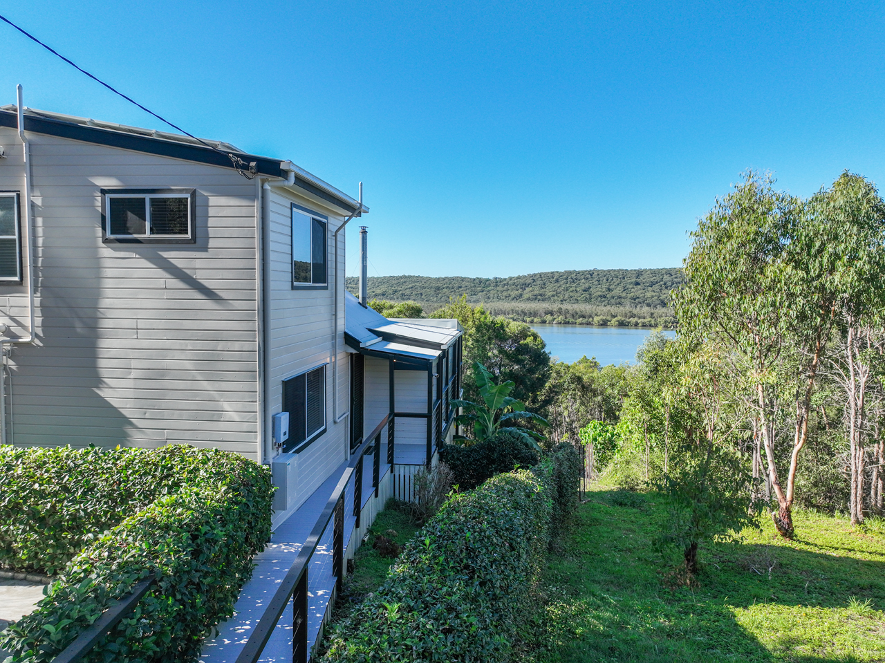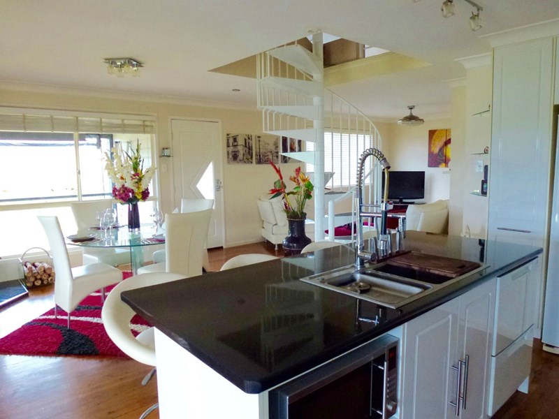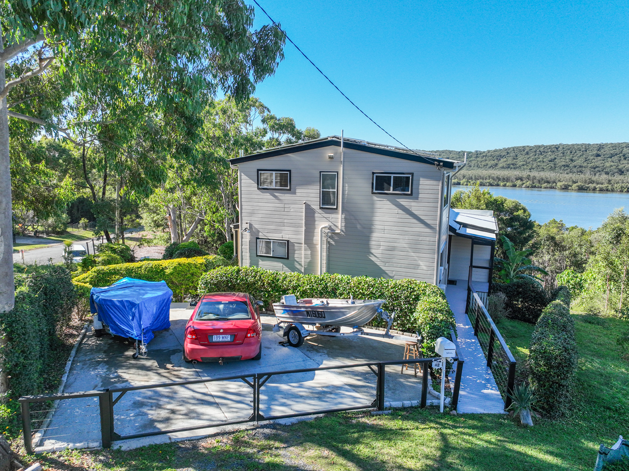 PRICE REDUCED BY OWNER...!!! End of a waterfront cul-de-sac ...East side of island with Easterly water views from an elevated block. Two storey home with direct entry to open plan living / dining, modern kitchen with island bench, double size gas stove top ,electric oven ,stainless steel rangehood.. Rear bedroom / bathroom and leading out to large rumpus/family room complete with bar for entertaining family and friends...watch the sun rise or the full moon glisten on the water..!! Corner combustion heater for those cooler winter nights and spiral stair case leading