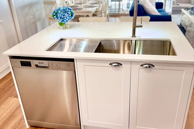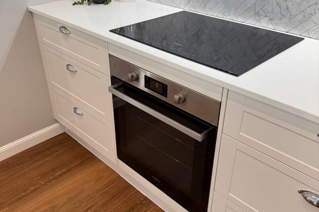 • Hamptons-style shaker cabinetry with 7-year warranty Polytec vinyl wrap doors.