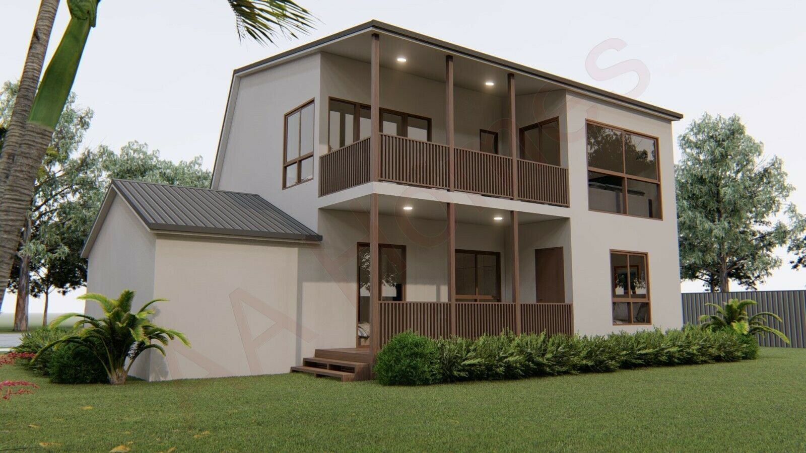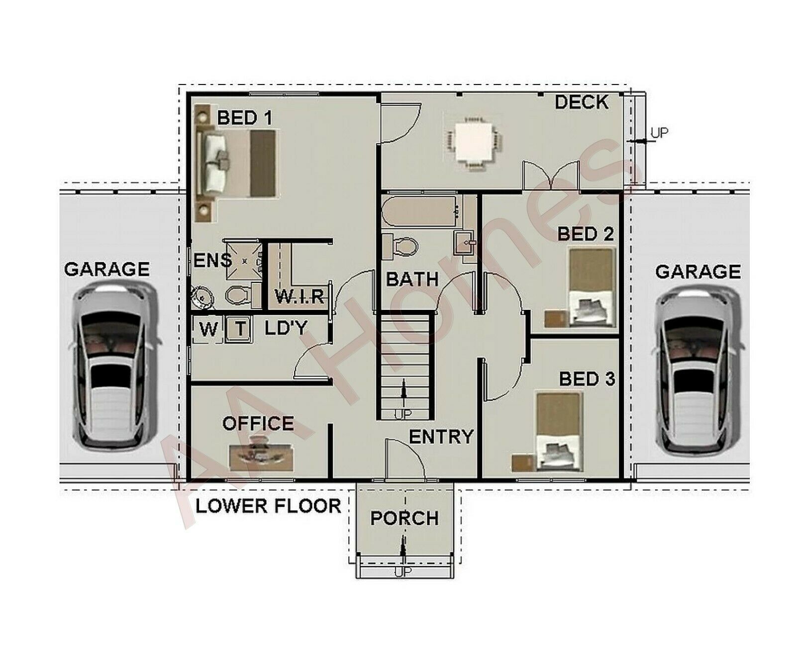 Ground Floor: 3 Medium size bedrooms, 2 bathrooms, Study, laundry, 10m² covered rear Deck, 3m² covered front porch & 2 single 18m² Garages.