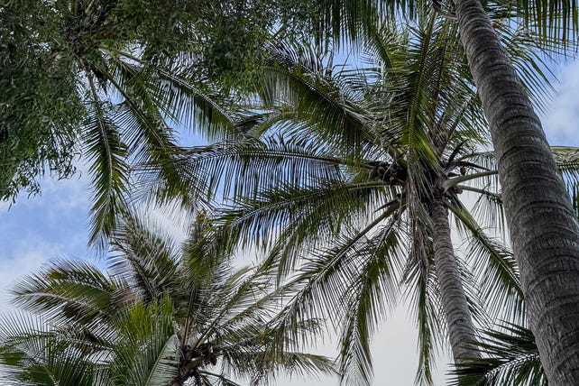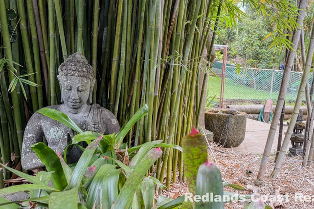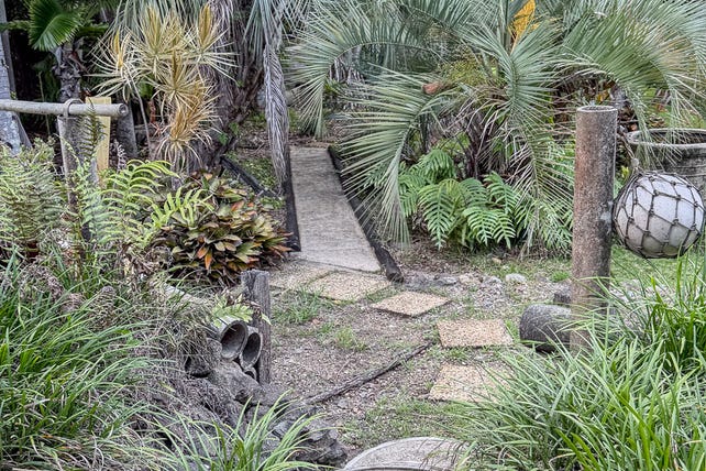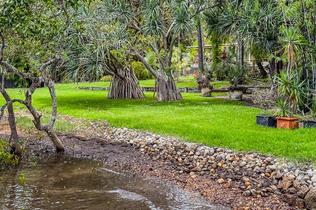 Expansive Grounds: Tropical oasis with mature gardens featuring coconut palms, pandanus, bamboo, elkhorns, palms, mango, citrus, and guava trees. An expansive grassy lawn stretches to the water’s edge, offering picturesque views. A deep water bore taps into groundwater for watering gardens. Note: the Balinese statues are not included in the sale.
